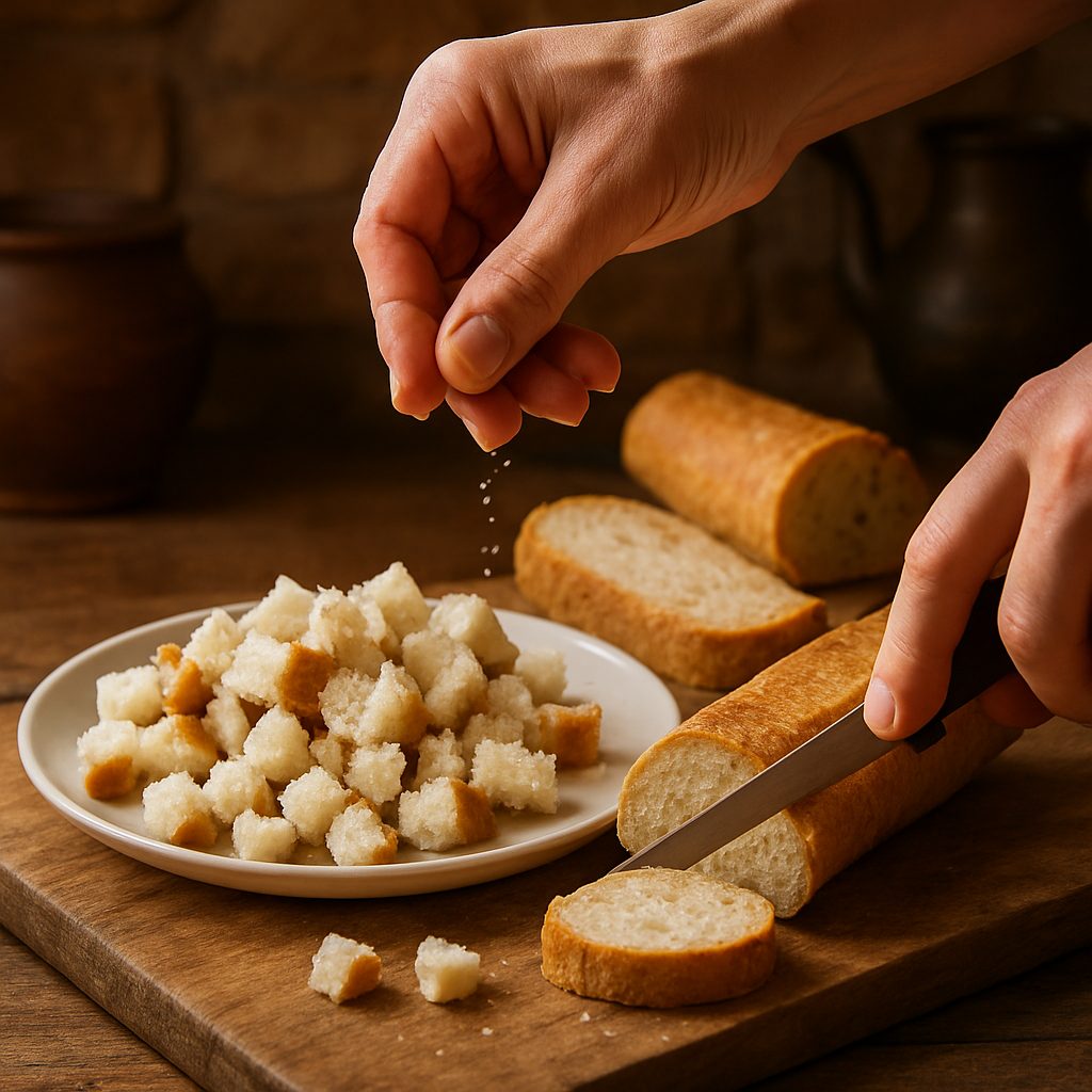 - Pan duro: El pan del día anterior es ideal para hacer migas. Si el pan está muy fresco, las migas no se formarán bien.