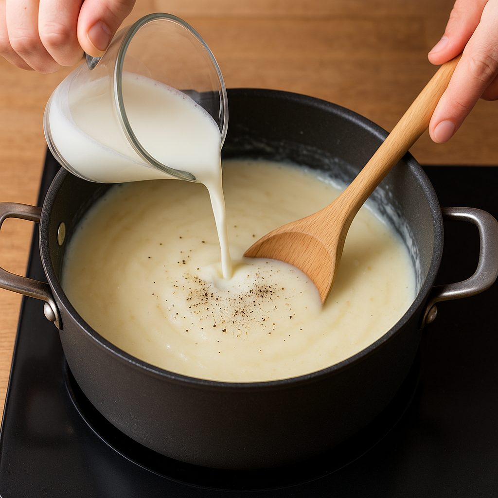 Poco a poco, agrega la leche mientras revuelves constantemente para evitar que se formen grumos. Cocina a fuego lento, removiendo continuamente, hasta que la mezcla espese y adquiera una consistencia cremosa. Agrega el caldo de los mejillones poco a poco, y sigue removiendo hasta que todo se integre bien. Sazona con sal y pimienta al gusto.