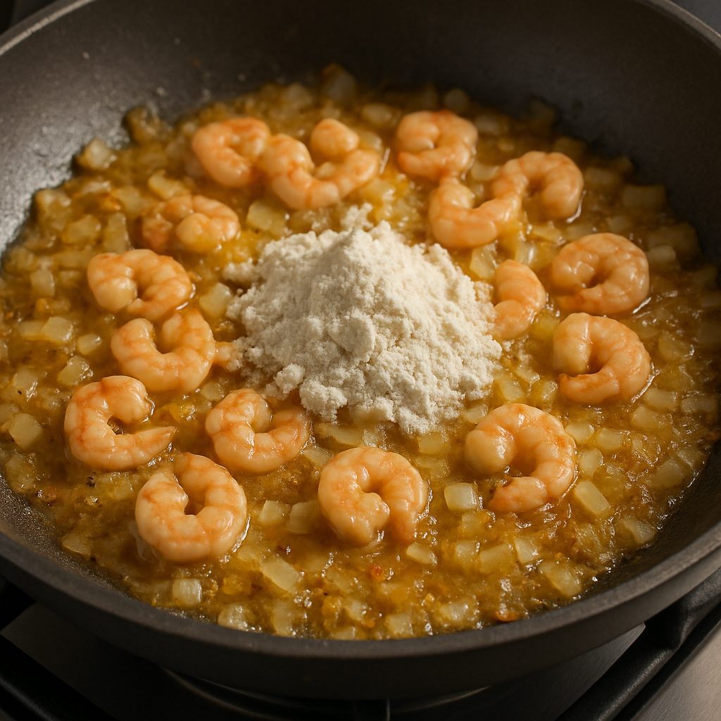 En una sartén grande, derrite la mantequilla y añade la cebolla y el ajo picados. Sofríe durante unos minutos hasta que estén dorados y fragantes. Luego, agrega las gambas (si las estás utilizando) y cocina hasta que estén bien hechas. A continuación, añade las dos cucharadas de harina y cocina durante un par de minutos para que pierda el sabor a crudo.