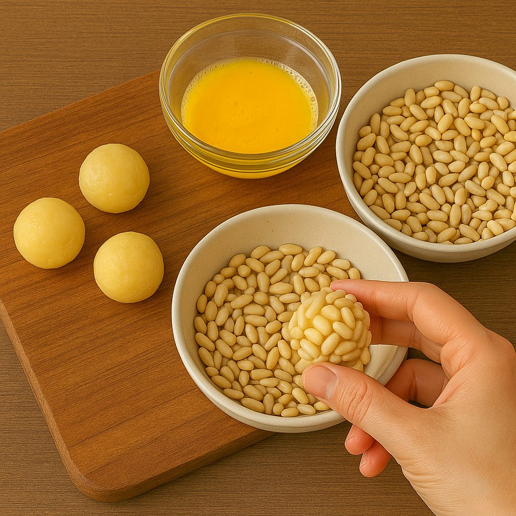 - Bate un huevo y pasa cada bola por él para que los piñones se adhieran mejor.